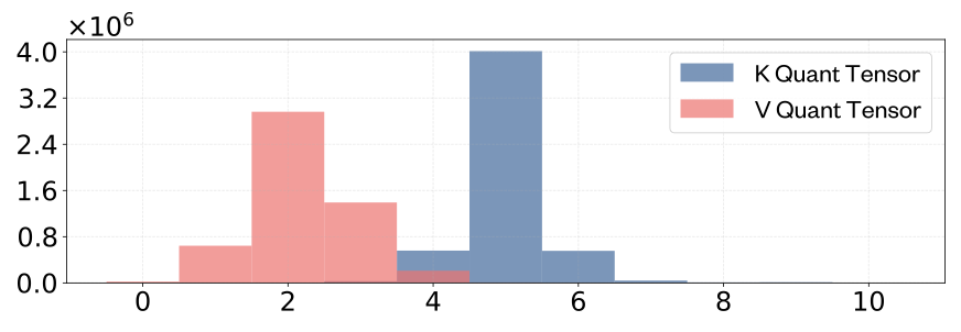 Why encode-aware repacking and bit-packing? We target a large compressionādecompression asymmetry. On Llama2-13B (40 layers, 5120 hidden, FP16/BF16) at 50 tokens/s, KV-cache generation is only 39.06Ā MB/sāmodest for modern compressorsāwhereas decoding must restore the entire KV cache for every new token; with thousand-token contexts, required decompression throughput is 3ā5 orders of magnitude higher compared to compression. Thus, we need an ultra-light decompressor that exploits the low-entropy distributions of quantized data (FigureĀ 5) and repeating patterns (FigureĀ 6), and that can be tightly fused with computation to cut memory traffic or even accelerate memory-bound kernels. Bit-packing best matches these constraints: it stores integers with minimal bits, excels on low-entropy, repetitive data, and we fuse it with matrixāvector operations. Encode-aware repacking further boosts compression by reordering KV vectors (leveraging the Permutation Invariance of KV Cache, introduced in [proof:permutation_invariance]) to increase per-pack homogeneity, improving the achievable encoding length without adding decompression overhead.