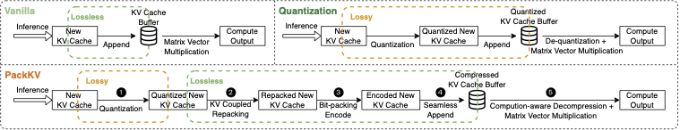 PackKV consists of three key steps: (1) Buffering and Blocking: Temporarily stores KV cache vectors and feeds complete blocks into the compressor. (2) Encode-aware Repacking and Bit-packing: Reorganize KV cache vectors to improve encoding efficiency, then applies bit-packing with adaptive storage formats for K and V. (3) Seamless Appending: Uses block-independent format to decouple compression/decompression, enabling single-kernel decompression.
