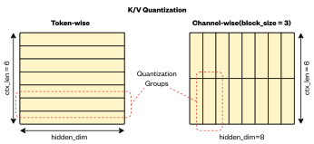 Several quantization granularities can be applied to the KV cache tensor (FigureĀ 7). KIVIĀ uses fine-grained channel-wise quantization for K cache and token-wise for V cache, exploiting channel correlations (i.e., column-wise in FigureĀ 6). However, quantization-only methods have limited flexibility as bit-widths must be integers (2, 3, or 4 bits). Higher compression ratios require reducing bit-width, but this demands smaller quantization units to maintain model accuracy, increasing metadata overhead. For KIVIās 2-bit K quantization with 64-element blocks which is recommended by KIVI (even 128 is not recommended), the actual compression ratio is only 6.4 (not 8) due to FP16 metadata. If bit-width falls back to 3 bits, compression drops to 4.57 which is close to that of coarse-grained 4-bit quantization. This reveals quantizationās dilemma: Using finer quantization granularity to reach lower bit widths inflates metadata, capping overall compression.