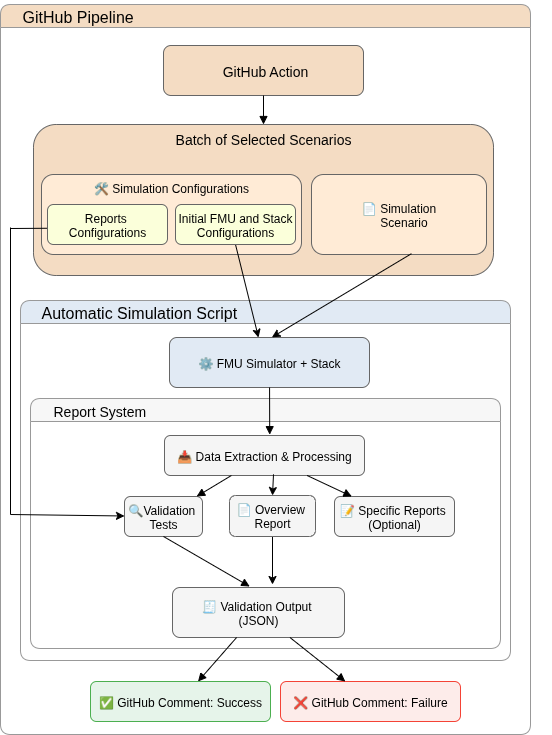 The accurate simulationās physics, and in particular its initialization and integration into the testing pipeline, and its execution speedup are presented in Section 2. In Section 3, we describe the automatic simulation process based on configuration files and scripts. The module that injects faults into the simulation is presented in Section 4. The complete automated testing and reporting system, able to automatically start, finish, and analyze the simulation, is described in Section 5 while its integration in the GitHub Pipeline is presented in Section 6. Examples of scenarios and the results are presented in Section 7. The conclusions and future works are discussed in Section 8.