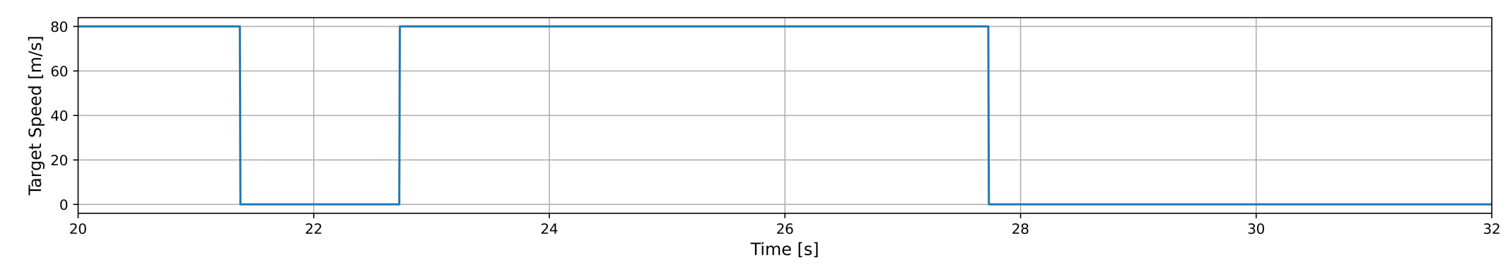 In this section we provide an example of how executing the same scenario with slightly different parameters helps to efficiently test the robustness of the stack. In this example scenario, in the Las Vegas Motor Speedway (LVMS) oval track, the ego vehicle is initialized at 270 km/h, and a ghost opponent is initialized at 220 km/h, 100m in front of it. The scenario consists of the injection of a fault at the beginning of the overtake.