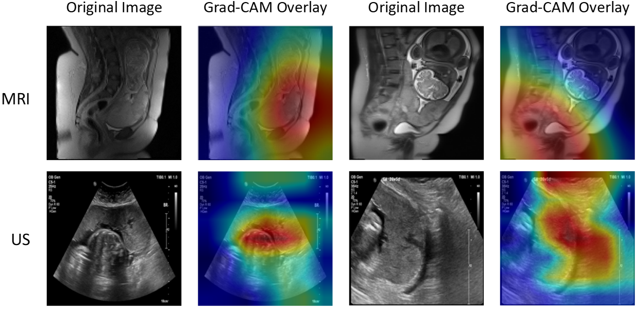By visualizing the Grad-CAM heatmaps for MRI and US images, it was observed that the multimodal model primarily focused on anatomically relevant regions associated with PASĀ . In MRI, the attention was concentrated on the uterine wall and areas of abnormal placental invasion, while in US, the model highlighted the lower uterine segment and the interface between the placenta and myometrium, which are known key signs of PASĀ . These findings suggest that the model correctly identifies the critical regions that are indicative of PAS. The attention maps provide insights into the decision-making process of the model, supporting the reliability of the predictions and enhancing interpretability, which is crucial for clinical application.