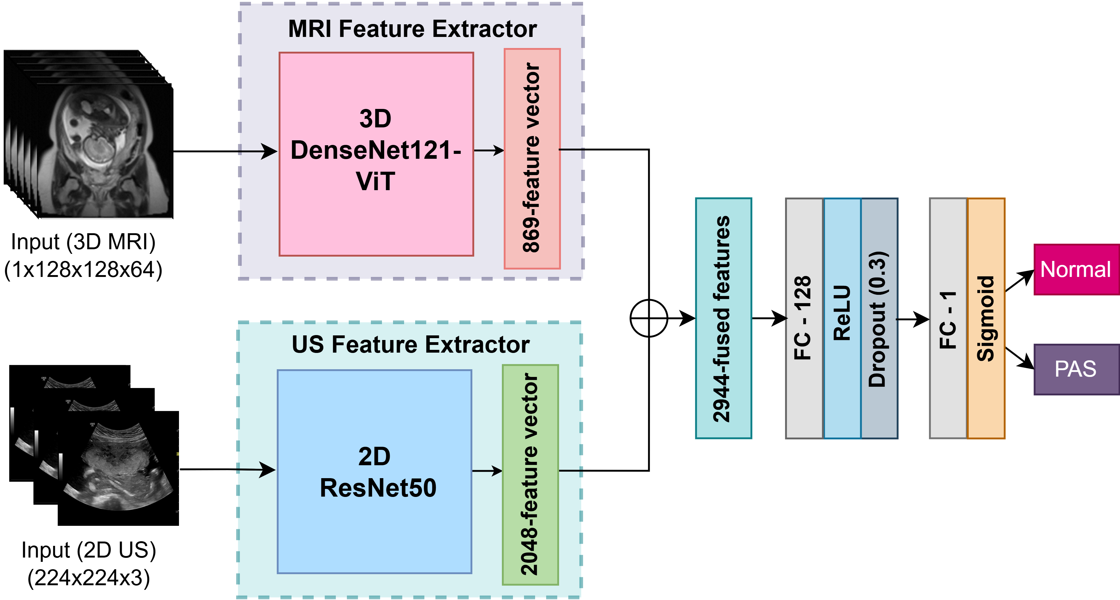 The main motivation behind this study is to increase the accuracy and reliability of PAS detection by taking advantage of deep learning and multimodal data to help healthcare practitioners make informed decisions and deliver appropriate prenatal care. Integrating data from various sources will enable a more detailed view of a patientās condition, enhance diagnostic accuracy, and potentially reduce false positives and negativesĀ . Therefore, this study develops a multimodal deep learning model that uses an intermediate feature fusion method to identify PAS from a curated dataset of 1,293 MRI and 1,143 US images.