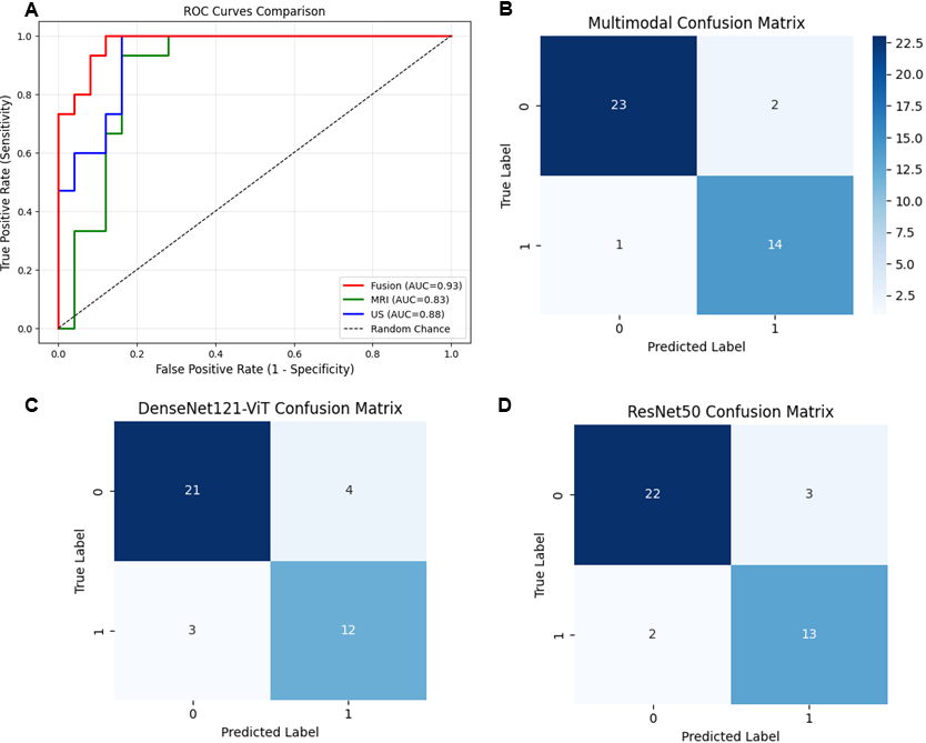Statistical analysis demonstrates that integrating MRI and US features gives a statistically significant performance improvement over unimodal models. The multimodal approach consistently achieved higher Accuracy, AUC, Recall, and F1-score, indicating improved overall detection capability and sensitivity. The lack of significant improvement in Precision compared to the US-only model suggests that while fusion helps identify more true positives, it may not greatly reduce false positives. Overall, these findings highlight the complementary nature of MRI and US modalities and support the effectiveness of multimodal fusion for robust classification. This supports the primary hypothesis of the study that combining imaging modalities could provide more comprehensive and accurate diagnostic information than either modality alone.