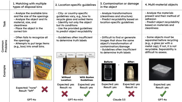 Lastly, it evaluates how well models can determine recyclability when waste items are contaminated or damaged. It’s similar to deciding whether a torn book should be repaired and reused or discarded.
