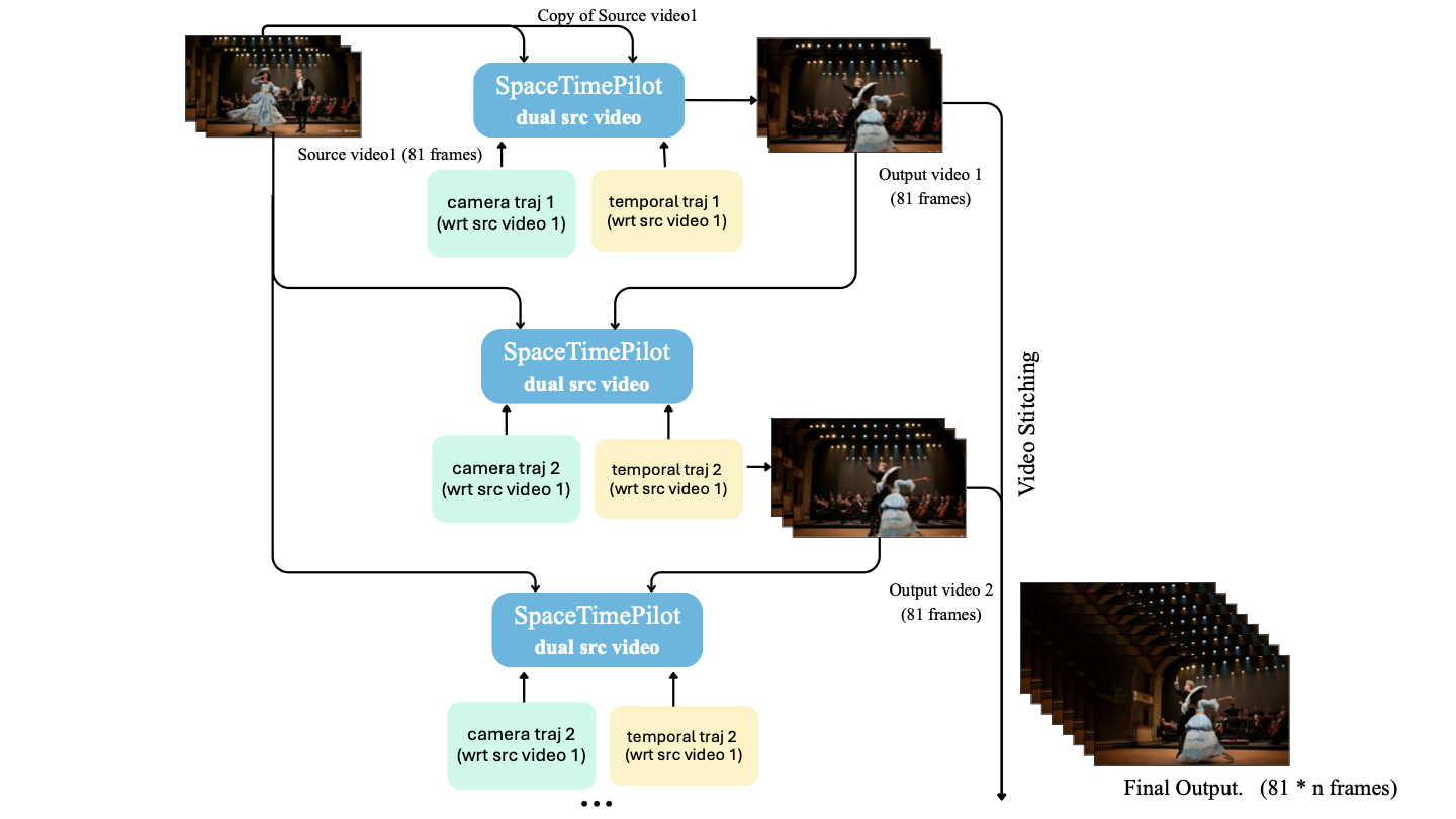 One of the central advantages of SpaceTimePilot is its ability to freely navigate both spatial and temporal dimensions, with arbitrary starting points in each dimension and fully customizable trajectories through them. Although each individual generation is limited to an 81-frame window, we show that SpaceTimePilot can effectively extend this window indefinitely through a multi-turn autoregressive inference scheme, enabling continuous and controllable spaceātime exploration from a single input video. The overall pipeline is illustrated in 8.