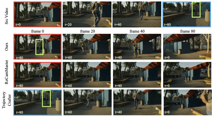 Besides the quantitative evaluation, we also demonstrate the strength of SpaceTimePilot with visual examples. In 5, we show that only our method correctly synthesizes both the camera motion (red boxes) and the animation-time state (green boxes). While ReCamMaster handles camera control well, it cannot modify the temporal state, such as enabling reverse playback. TrajectoryCrafter, in contrast, is confused by the reverse frame shuffle, causing the camera pose of the last source frame (blue boxes) to incorrectly appear in the first frame of the generated video. More visual results can be found in 4.