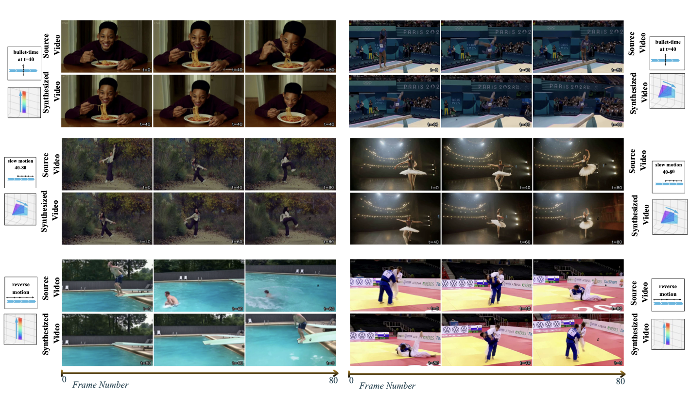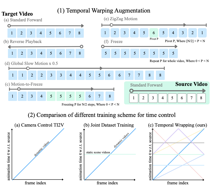(Top) For multi-view dynamic scene datasets, a set of temporal warping operations, including reverse, playback, zigzag motion, slow motion, and freeze are apppplied with teh source video as standford. This gives explicit supervision for temporal control, without constructing additional temporally varied training data.