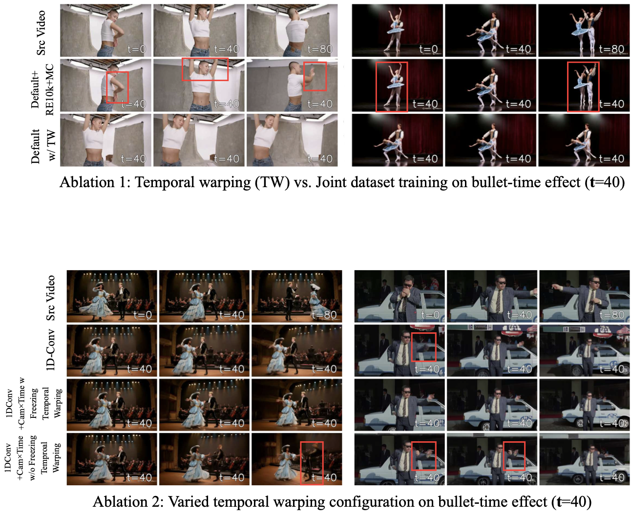 Using as our default datasets, we compare training jointly with static-scene datasets with applying only temporal warping (TW) augmentation on the default datasets (Sec.Ā 3.2.2 in the main paper). Although static-scene datasets naturally support bullet-time effects, they do not provide enough diversity of temporal control configurations for models to reliably learn time locking on their own, as shown in 10 (top). Please refer to section āEffective Temporal Warpingā in the website for more videos.