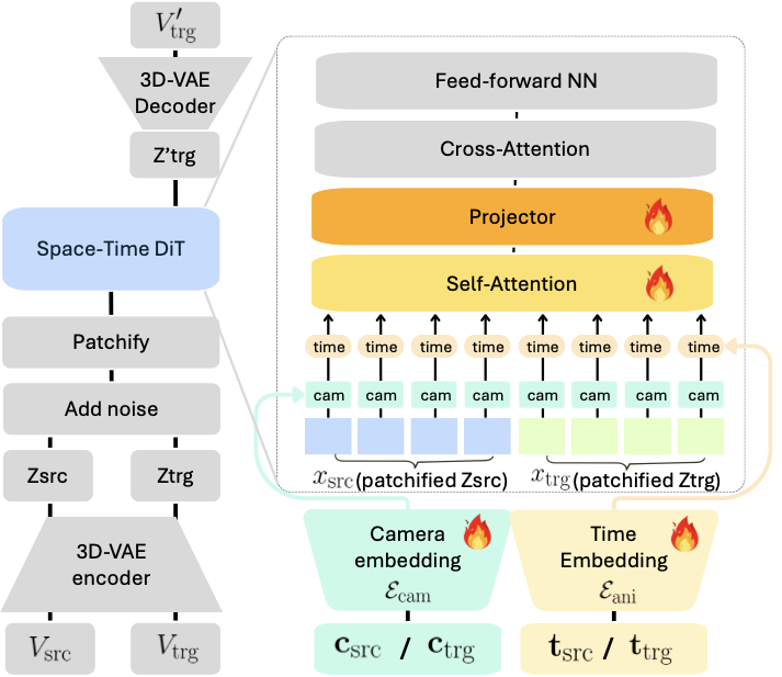 The network architecture of SpaceTimePilot is depicted in 7. The newly introduced animation-time embedder $`\mathcal{E}_{\text{ani}}`$ encodes the source and target animation times, $`\mathbf{t}_\text{src}`$ and $`\mathbf{t}_\text{trg}`$, into tensors matching the shapes of $`x_\text{src}`$ and $`x_\text{trg}`$, which are then added to them respectively. During training, we train only the camera embedder $`\mathcal{E}_{\text{cam}}`$, the animation-time embedder $`\mathcal{E}_{\text{ani}}`$, the self-attention (full-3D attention), and the projector layers before the cross-attention.