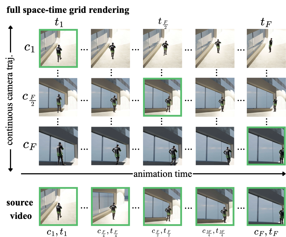 We introduce SpaceTimePilot, a method that takes a source video $`V_{\text{src}}\in \mathbb{R}^{F\times C\times H\times W}`$ as input and synthesizes a target video $`V_{\text{trg}}\in \mathbb{R}^{F\times C\times H\times W}`$, following an input camera trajectory $`\mathbf{c}_{\text{trg}}\in \mathbb{R}^{F\times 3 \times 4}`$ and temporal control signal $`\mathbf{t}_{\text{trg}} \in \mathbb{R}^{F}`$. Here, $`F`$ denotes the number of frames, $`C`$ the number of color channels, and $`H`$ and $`W`$ are the frame height and width, respectively. Each $`\mathbf{c}_{\text{trg}}^{f} \in \mathbb{R}^{3 \times 4}`$ represents the camera extrinsic parameters (rotation and translation) at frame $`f`$, with respect to the 1st frame of $`V_{\text{src}}`$. The target video $`V_{\text{trg}}`$ preserves the sceneās underlying dynamics, geometry, and appearance in $`V_{\text{src}}`$, while adhering to the camera motion and temporal progression specified by $`\mathbf{c}_{\text{trg}}`$ and $`\mathbf{t}_{\text{trg}}`$. A key feature of our method is the disentanglement of spatial and temporal factors in the generative process, enabling effects such as bullet-time and retimed playback from novel viewpoints (see [fig:teaser]).