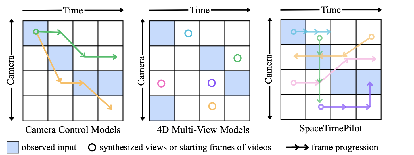 1. **SpaceTimePilot** is the first video diffusion model that allows for novel view synthesis and temporal control from a single video, akin to being able to freely adjust the viewing angle of a 3D movie. 2. The *temporal-warping training scheme* modifies existing multi-view video datasets to simulate diverse temporal variations. This can be compared to warping frames in a video to achieve effects like reverse playback or slow motion. 3. The **Cam$`\times`$Time** dataset provides rich information on camera and time combinations, allowing for effective learning of spatial and temporal control, similar to having a laser pointer that allows free movement through each frame of the video.š Full Paper Content (ArXiv Source)