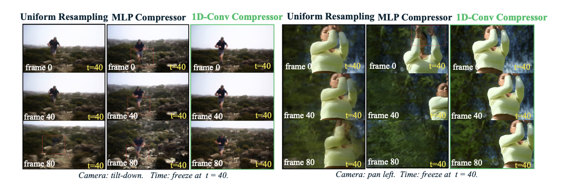 To validate the effectiveness of the proposed Time embedding module, in Table [tab:time_embed_ablation], we follow the time-control evaluation set up in Sec.Ā 4.1.1 and compare our 1D convolutional time embedding against several variants and alternatives discussed in Sec.Ā 3.2.1: (1) Uniform-Sampling: sampling the 81-frame embedding uniformly to a 21-frame sequence, which is equivalent to adopting sinusoidal embeddings at the latent frame $`f'`$ level; (2) 1D-Conv: using 1D convolution layers to compress from $`\mathbf{t}\in \mathbb{R}^F`$ to $`\mathbf{t}\in \mathbb{R}^{F'}`$, trained with ReCamMaster and SynCamMaster datasets. (3) 1D-Conv+jointdata: row 2 but including additionally static-scene datasets . (4) 1D-Conv (ours): row 2 but instead including the proposed Cam$`\times`$Time. We observe that applying a 1D convolution to learn a compact representation by compressing the fine-grained $`F`$-dim embeddings into a $`F'`$-dim space performs notably better than directly constructing sinusoidal embeddings at the coarse $`f'`$ level. Incorporating static-scene datasets yields only limited improvements, likely due to their restricted temporal control patterns. By contrast, using the proposed Cam$`\times`$Time consistently delivers the largest gains across all three metrics, confirming the effectiveness of our newly introduced datasets. Furthermore, as shown in 6, we present a visual comparison of bullet-time results using uniform sampling and an MLP instead of the 1D convolution for compressing the temporal control signal. Uniform sampling produces noticeable artifacts, and the MLP compressor causes abrupt camera motion, whereas the 1D convolution effectively locks the animation time and enables smooth camera movement.