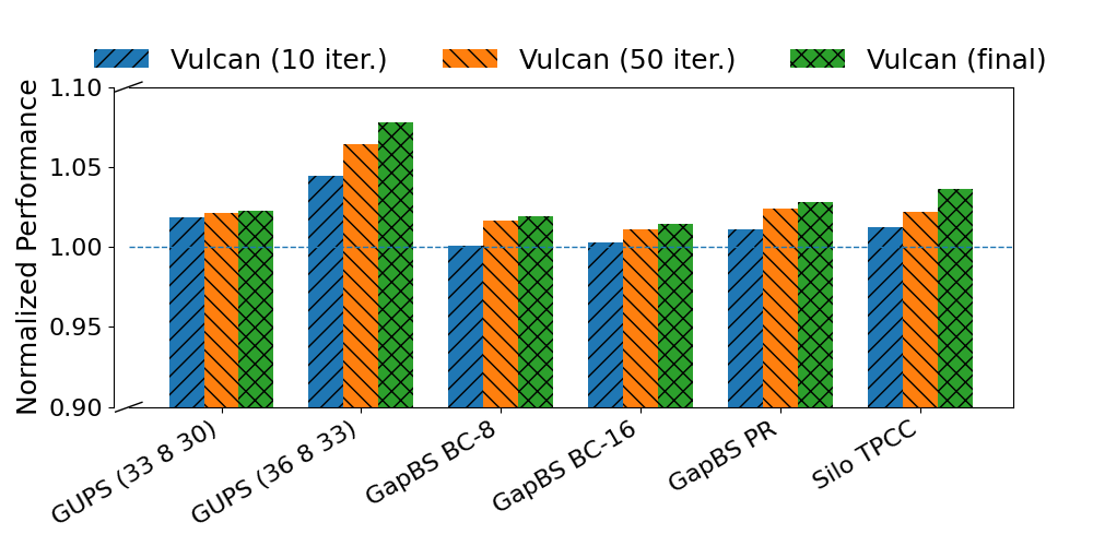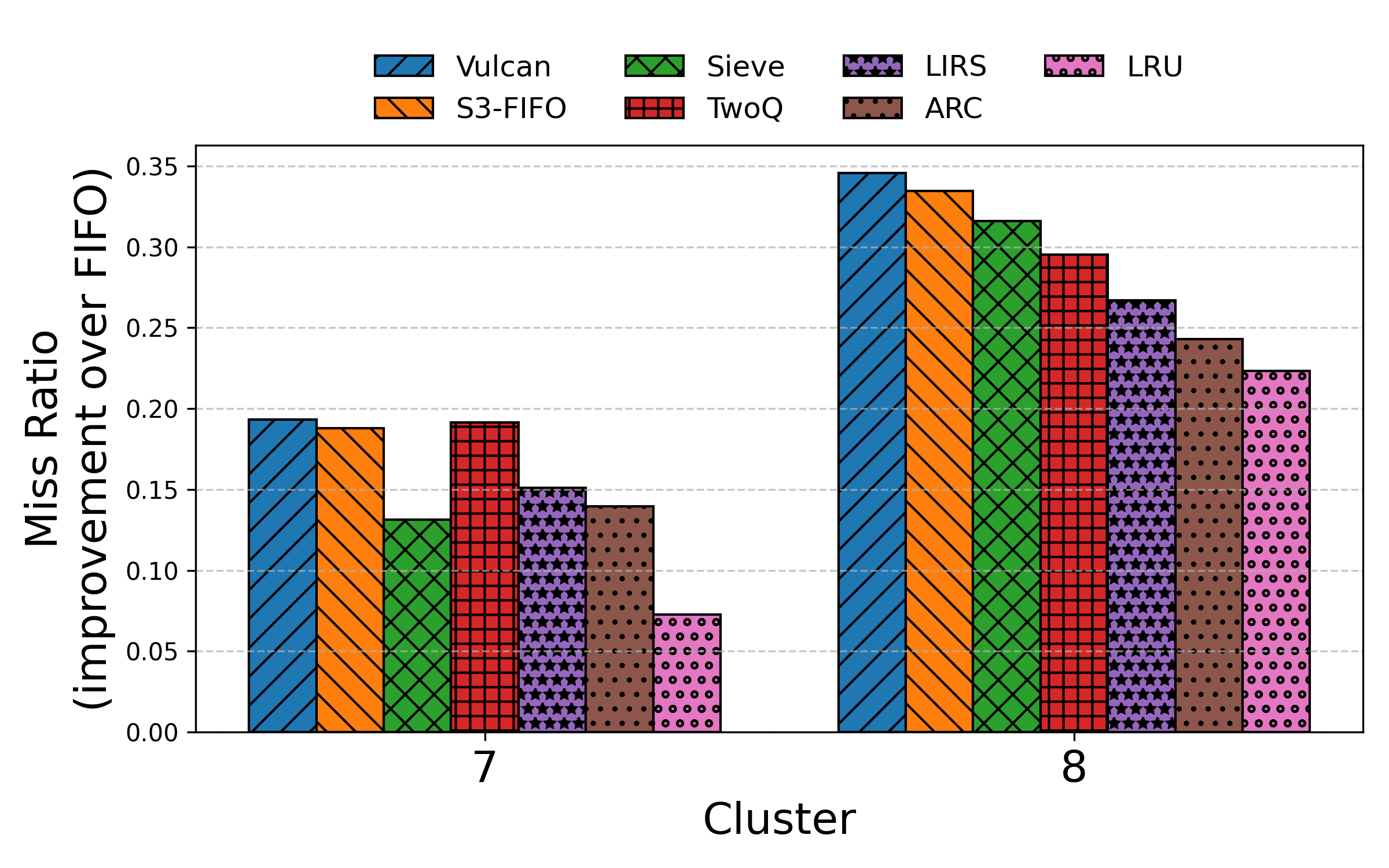 In this paper, we instantiate Vulcan for two policies: cache eviction (§4) and page promotion in tiered-memory systems (§5). We discuss specific choices we made for both of these policies in the design space exposed by the aforementioned three-step process. Across ten different instances, cache eviction policies synthesized by Vulcan either nearly match state-of-the-art baselines or outperform them by 1.94% to 69%. Memory tiering policies designed with Vulcan yield 2.5-7.9% improvement over state-of-the-art baselines, for a variety of workloads.