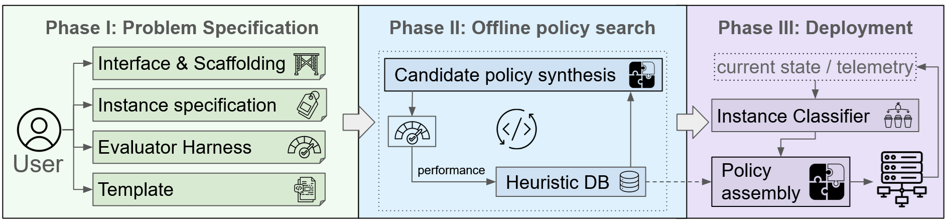 Historically, this search for instance-optimality1 has been conducted manually, by researchers and developers. As workloads grow increasingly diverse, performance objectives become multi-dimensional, and hardware evolves rapidly toward greater heterogeneity, such manual exploration is no longer tractable. This brings to the fore a clear need for an automated search for systems heuristics. Recently, neural models have been seen as an alternative to this search, learning from large datasets to predict near-optimal decisions across varied inputs . However, these approaches come at a steep cost: opaque behavior , complex training and deployment pipelines , inference overheads , and safety concerns make their operation and adoption challenging.