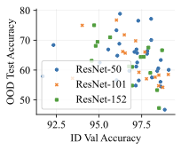 In our image classification experiments, our generative classifier used a standard 395M parameter UNet , which is far more than the 26M parameters in its ResNet-50 discriminative counterpart. Could the greater parameter count could be responsible for the difference in performance and OOD behavior? We first note that the discriminative classifier used for CivilComments in Table [tab:main] contains 67M parameters, which is more than the 42M parameters we use in our autoregressive generative classifier. Furthermore, the architectures and parameter counts of the discriminative $`p(y \mid x)`$ and generative $`p(x \mid y)`$ classifiers are exactly matched in Table 3. On image tasks, we test whether parameter count matters by scaling from ResNet-50 up to ResNet-152 . We perform a sweep over model size and training hyperparameters (learning rate and weight decay). [fig:model_size] and 6 show that increasing discriminative model size does not improve performance. This aligns with previous work: found that increasing discriminative model size can actually hurt OOD performance.