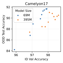 We tried different model scales on three of our distribution shift benchmarks: FMoW, CivilComments, and Camelyon17. 7 shows the results of our investigation. On FMoW and CivilComments, scaling model size significantly improves performance both in- and out-of-distribution. However, on Camelyon17, a smaller model actually does significantly better out-of-distribution than a model that is 5.5 times as large. This indicates that overfitting can become an issue in this setting, where we have limited training data and must be careful about overfitting. Overall, we are excited by the fact that scaling generative classifiers can be beneficial in some settings, unlike discrimiminative classifiers, which consistently show poor use of extra model capacity (see [fig:model_size], 3, 6).