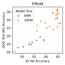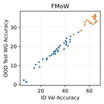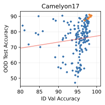 Benchmarks We use five standard benchmarks for distribution shift. Camelyon undergoes domain shift, so we report its OOD accuracy on the test data. Waterbirds, CelebA, and CivilComments undergo subpopulation shift, so we report worst group accuracy. FMoW has both subpopulation shift over regions and a domain shift across time, so we report OOD worst group accuracy. The first four are image benchmarks, while CivilComments is text classification. Waterbirds and CelebA are natural images, whereas Camelyon contains whole-slide images of cells and FMoW contains satellite images. In total, these benchmarks cover multiple shift types, modalities, and styles.