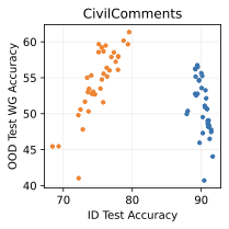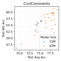 For CivilComments, we use a randomly initialized encoder-only transformer with the same architecture as DistilBert . We train for 100 epochs and sweep over dropout rate, learning rate, and weight decay.