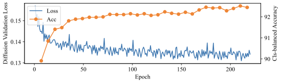 However, even though sample quality is not necessary for high accuracy, we do find that validation diffusion loss correlates well with class-balanced accuracy. As the loss decreases, class-balanced accuracy correspondingly increases. Figure 10 shows how an increase in validation diffusion loss due to overfitting translates to a corresponding decrease in classification accuracy on Waterbirds.