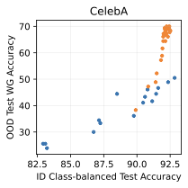 We believe that it is unrealistic or impractical to know the exact distribution shift that will happen on the test set. Thus, we do not use knowledge of the spurious correlation or distribution shift when training or performing model selection, and instead tune hyperparameters and perform early stopping on the in-distribution validation accuracy, not the worst-group accuracy. This is the most valuable setting, as it matches how models are often deployed in practice, and thus is a popular experimental setting for evaluating methods . We use class-balanced accuracy for model selection as it uniformly improves performance on each dataset for all methods .