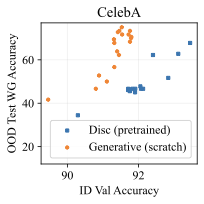 All of our experiments so far train the classifier (whether discriminative or generative) from scratch. This is done to ensure a fair, apples-to-apples comparison between methods. What happens if we use a pretrained discriminative model? In preliminary comparisons, we use a ResNet-50 pretrained with supervised learning on ImageNet-1k and finetune it on CelebA. 11 shows the results of this unfair comparison between a pretrained discriminative model versus our generative classifier trained from scratch. We find that pretraining helps, but it does not significantly close the gap with the generative classifier. This is in spite of the fact that the discriminative model has seen an extra 1.2 million labeled training images, those labels have more bits (since there are 1000 classes instead of just two), and the pretraining classification task has minimal spurious correlations that are relevant to the downstream task.