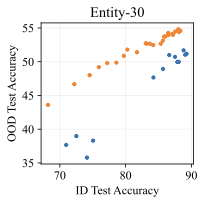 We additionally run experiments on two highly-used subpopulation shift benchmarks from BREEDSÂ : Living-17 (with 17 animal classes) and Entity-30 (with 30 classes). As usual, we train our diffusion-based generative classifiers from scratch on each training set and evaluate them on the in-distribution and out-of-distribution test sets. We compare against discriminative baselines reported in the original BREEDS paper, which includes interventions such as stronger augmentations or adversarial training. 8 displays the same trends here as our main results. Both datasets display effective robustness (for a given ID accuracy, the OOD accuracy of the generative classifier is higher), though the effect is much stronger on Entity-30.