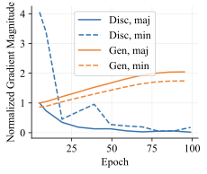 Our intuition is that the generative objective $`\log p_\theta(x \mid y)`$ provides more consistent learning signal across epochs. In contrast, discriminative models may use spurious features to make confident and correct predictions on the training set and lose the gradient signal necessary to use the core features. We test this by measuring the gradient norm on majority and minority examples across epochs. We compute the per-example gradient norm $`\|\nabla_\theta \mathcal L(x_i, y_i) \|_2`$ and average it over the majority and minority groups. We normalize this by the average majority group gradient norm at epoch 5 in order to fairly compare different architectures that have different loss landscapes. Figure [fig:grad_norm] shows these metrics on CivilComments with toxic comments about the Black demographic as the minority group. For the discriminative model, the majority group gradient quickly vanishes, and the minority group gradient starts high but eventually decays. The generative classifier, however, has very similar gradient norm across the majority and minority groups, and the gradient norm actually slightly increases over training. These results support our intuition that the generative objective helps the model learn more from examples with and without the spurious features. Note: the per-example gradient norm for generative classifiers does not go to 0, since there is always a way to increase the likelihood of a single data point.