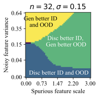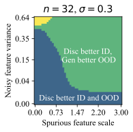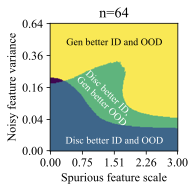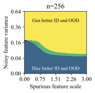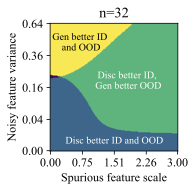 The discriminative classifier is better ID, but the generative classifier is better OOD. This phase occurs at a sweet spot of $`\mathcal B`$ and $`\sigma_{noise}^2`$. Moderate noise allows some overfitting, but the spurious feature is strong enough for the discriminative model to achieve good ID accuracy. However, its heavy reliance on the spurious feature reduces its OOD performance.