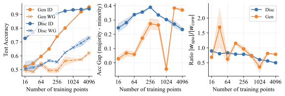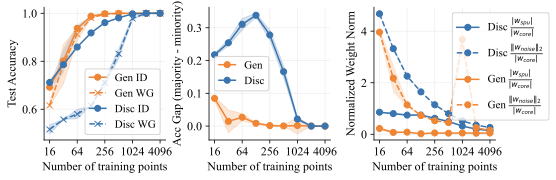 We carefully examine a setting where the generative approach has the same in-distribution performance, but it outperforms the discriminative approach on the worst group (OOD). Figure 4 compares the behavior of LDA and logistic regression on toy data with data dimension $`d=1026`$ and noise variance $`\sigma_{noise}^2 = 0.36`$. We find that both methods have similar in-distribution accuracies, but LDA does significantly better on the minority group. In fact, Figure 4 (middle) shows that LDA has essentially no performance gap between the majority and minority groups, which indicates that it does not use the spurious feature at all. In contrast, logistic regression has a large performance gap between the groups. This can be explained by looking at the linear coefficients learned by both methods. Figure 4 (right) shows the ratio $`{|w_{spu}|}/{|w_{core}|}`$ between the weights on the shortcut and core features. Ideally, this ratio goes to 0 as fast as possible as the model sees more data. Logistic regression, however, places significant weight on the spurious feature until it gets thousands of training examples. LDA is far more data-efficient and places almost no weight on the spurious feature with as few as 16 training examples. Interestingly, logistic regression puts more weight on the noisy features than LDA does. It is only by putting significant weight on the spurious feature that it achieves good in-distribution performance, though this hurts worst group accuracy.
