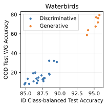 Table [tab:main] compares generative classifiers against discriminative baselines on the distribution shift benchmarks. Compared to the discriminative baselines, generative classifiers have better worst-group or OOD accuracy on all five datasets. Surprisingly, generative classifiers also achieve significantly better in-distribution accuracy on three of the five datasets, which indicates less overfitting. These results suggest that generative classifiers may have an advantage in both (a) learning core features that generalize across distribution shifts, and (b) learning features that generalize from the training set to the ID test set.
