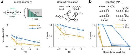 For the counting task in c, the indexed symbols (e.g., $`\mathrm{A}_\mathrm{1}`$ or $`\mathrm{X}_\mathrm{3}`$) denote distinct stimuli. For each string, there is a single target defined for the last filler element $`\mathrm{X}_\mathrm{j}`$ and corresponding to the correct dependent item $`\mathrm{B}_\mathrm{i}`$. Here an epoch consists of single presentations of all unique strings allowed by the task parameters, and we set $`\mathcal{E}^\mathrm{CS}_\mathrm{train}=250`$ and $`\mathcal{E}^\mathrm{AKF}_\mathrm{train}=500`$, as well as $`\mathcal{E}_\mathrm{test} = 100`$ for both models.