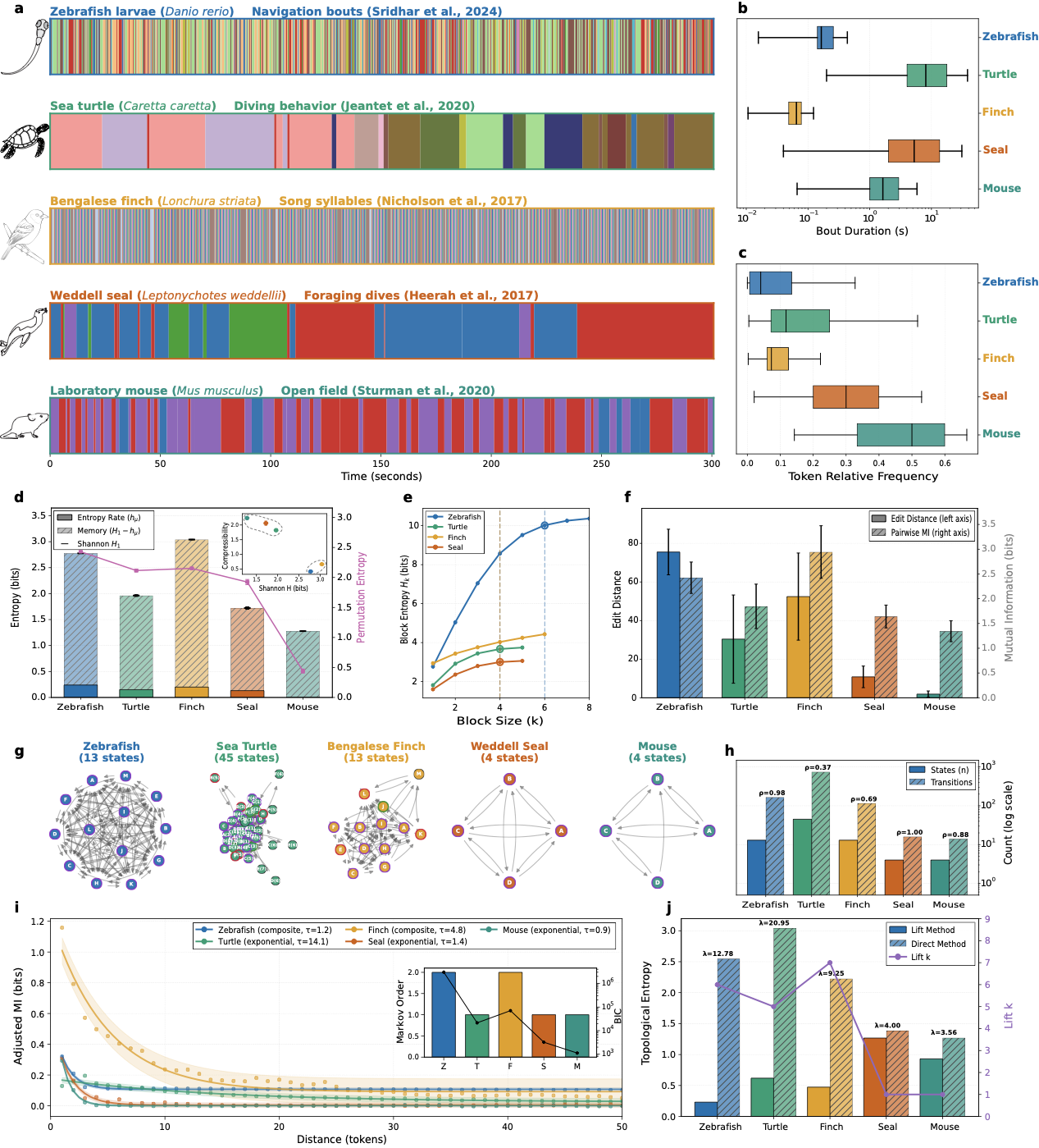 characterize the underlying generative mechanisms and computational capacity of sequence-producing systems. Markov order estimation employs information-theoretic model selection criteria (Akaike Information Criterion, Bayesian Information Criterion) to determine optimal dependency range, assuming Markovianity: $`\hat{k} = \mathop{\mathrm{arg\,min}}_k \text{BIC}_k`$, where $`\text{BIC}_k = -2 \log L_k + p_k \log N`$ . For sequences exhibiting variable-length dependencies, we employ Variable-Length Markov Models (VLMC; ) to adaptively prune context trees using statistical significance criteria.
