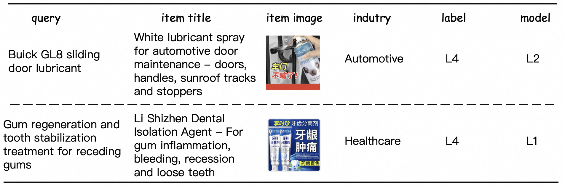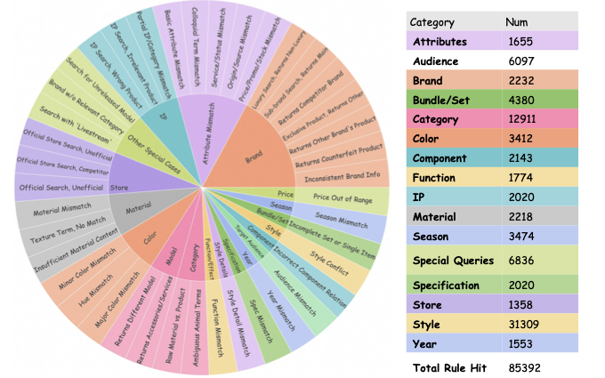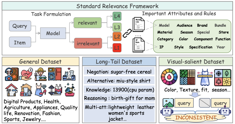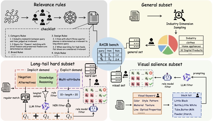 Second, We provide comprehensive and challenging evaluation data. The RAIR benchmark consisting of three parts: a general subset and two challenging subsets. 1)General subset. This subset is designed to evaluate modelsā fundamental capabilities in e-commerce relevance. Through strategic stratified sampling across industry sectors and careful calibration of data proportions based on industry distributions, we constructed a balanced dataset that comprehensively captures real-world e-commerce scenarios while mitigating potential domain bias. (2) Long-tail hard subset. This subset is constructed as a challenging testbed to probe the upper bounds of modelsā reasoning and knowledge capabilities. we employed a systematic sampling approach for complex queries. We first defined a taxonomy of special-intent queries (e.g., negation, reasoning-dependent) and multi-attribute requirements quires, extracted candidates from search logs using rule-based methods, and then applied an LLM-based filtering pipeline to retain the most challenging cases. (3)visual salience subset. This subset is aim to comprehensively evaluate modelsā multimodal capabilities. we developed a taxonomy of visual-related keywords and retrieved query-ad pairs across exposure channels, using a blacklist to eliminate false matches. The samples were then refined through an LLM-based pipeline for visual attribute verification and difficulty-based screening. Each instance across all subsets is accompanied by assessment criteria and privacy-compliant product images.