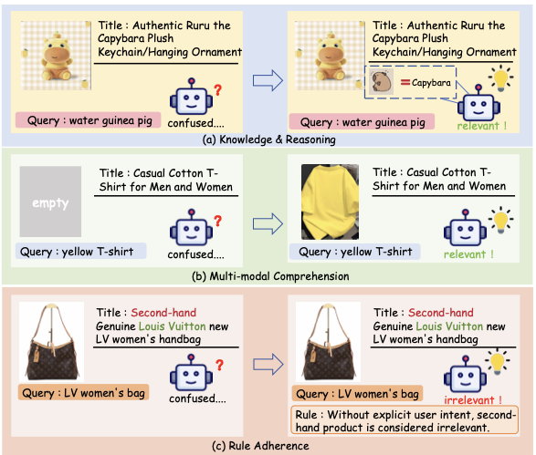 A comprehensive relevance benchmark for LLMs and Visual Language Models(VLMs) should include diverse e-commerce data and evaluate most critical competencies, which we have synthesized into the following three aspects as illustrated in Figure 1. (1) Knowledge & Reasoning Capability, which represents the fundamental model capability requirements for relevance assessment. Complex e-commerce scenarios demand reasoning that combines world knowledge with inference, surpassing basic matching mechanisms. As demonstrated in Figure 1(a), accurate judgment requires the model to access its knowledge base to recognize that “Capybara is synonymous with water guinea pig.”, which illustrates the knowledge requirements for handling complex cases. (2) Multi-modal Comprehension Capability, which represents the advanced capability requirements. In real-world scenarios, Item images play a vital role in search results, significantly influencing user perception. Besides, Visual modalities provide complementary discriminative features that transcend textual representations. As shown in Figure 1(b), Visual information provides critical discriminative cues when textual features alone are insufficient. Although current approaches predominantly rely on LLMs, VLM-based relevance modeling represents an inevitable trend from a long-term perspective. (3)Rule Adherence Capability, which constitutes a crucial foundation for standardized relevance assessment. Relevance assessment is anchored in a sophisticated rule system, meticulously crafted by domain experts who synthesize user preferences to transform subjective relevance judgments into objective, quantifiable, and standardized protocols. In essence, this functions as complementary specifications for common knowledge scenarios. As illustrated in Figure 1(c), the model can make correct judgments when properly adhering to the rule “Without explicit user intent, second-hand product is considered irrelevant.” In current LLM-based approaches such as LREF and TaoSR1, rule compliance has emerged as a crucial capability requirement, and has been specifically modeled during the training process. Following the above insights, we aim to propose a comprehensive and challenging benchmark, providing a standard reference for evaluating modelsā relevance judgment capabilities in e-commerce scenarios. Furthermore, we aim to provide an e-commerce-specific lens for assessing general LLM and VLMās capabilities in instruction following, world knowledge application, and reasoning.