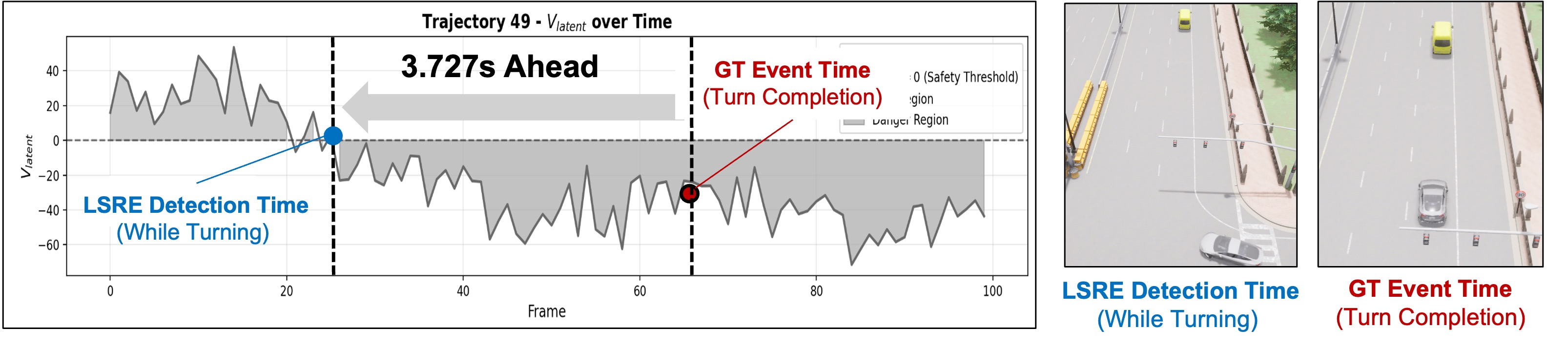 In an example case from School-Bus Stopping scenario, the ego vehicle initiates a right turn at an intersection and later encounters a stopped yellow school bus in its lane, resulting in a gradually developing hazard. Notably, $`V_{\mathrm{latent}}`$ starts to decrease at the beginning of the turning maneuver and crosses the $`V_{\mathrm{latent}}=0`$ threshold well before the GT boundary time, which occurs at turn completion. This yields a lead time of $`3.727\,\mathrm{s}`$. Similarly, in example cases from Emergency-Vehicle Yielding and Construction-Zone scenarios, LSRE identifies the annotated safety-state transition ahead of the GT boundary, with lead times of $`2.898\,\mathrm{s}`$ and $`3.086\,\mathrm{s}`$, respectively.