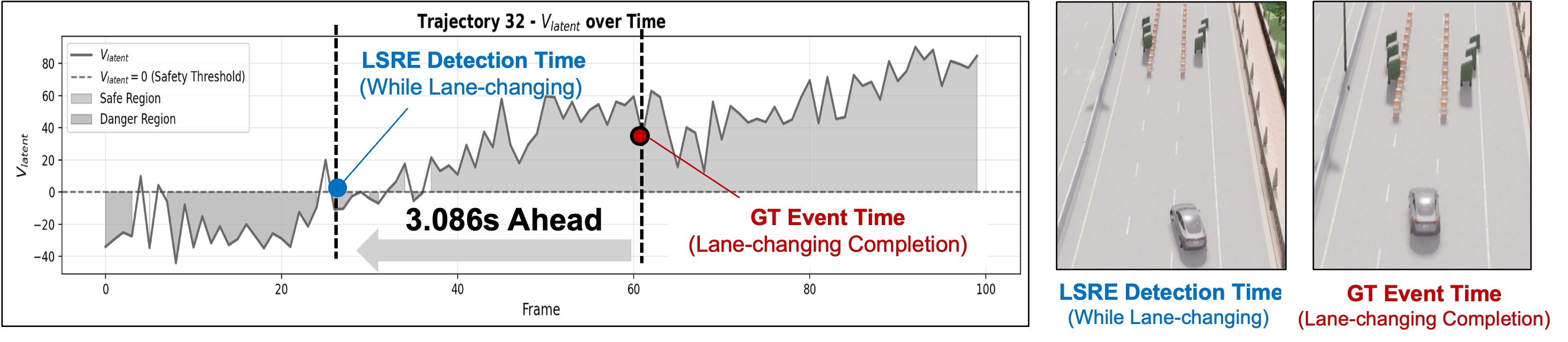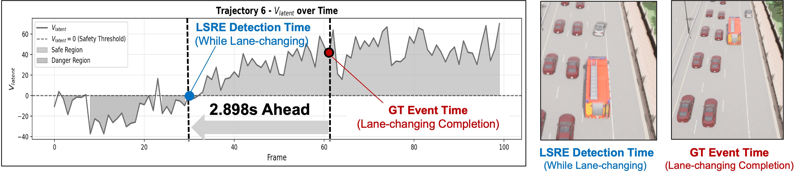 Fig. 3 visualizes the real-time signals produced by LSRE across three representative driving scenarios. The system outputs the future semantic value estimation $`V_{\mathrm{latent}}`$ over time. Dashed horizontal lines indicate the zero threshold ($`V_{\mathrm{latent}}=0`$, safe vs. unsafe), while the shaded backgrounds mark the inferred safe and danger regions. We highlight two key timestamps: the LSRE detection time, defined as the first time $`V_{\mathrm{latent}}`$ crosses the threshold, and the ground-truth (GT) boundary time, i.e., the annotated transition between semantic safe and unsafe states.