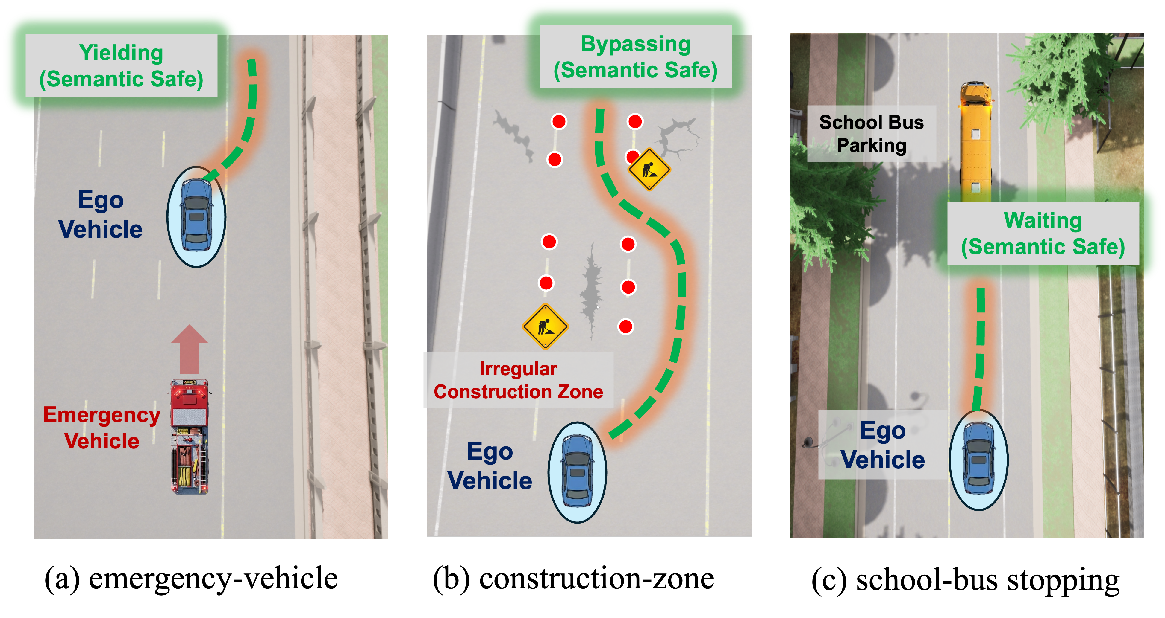 We evaluate the proposed semantic safety framework across six representative scenarios in CARLA, as shown in Fig.2. Our benchmark contains three core semanticâfailure categories, each instantiated with two scenario variants (inâdistribution and fewâshot): (1) rear-approaching emergency-vehicle yielding, (2) construction-zone lane inference, and (3) school-bus stopping. Each category contains two sub-settings designed to assess both in-distribution performance and semantic generalization. These variants share the same semantic rule but differ significantly in appearance and layout, forming a total of six semantic-risk scenarios.