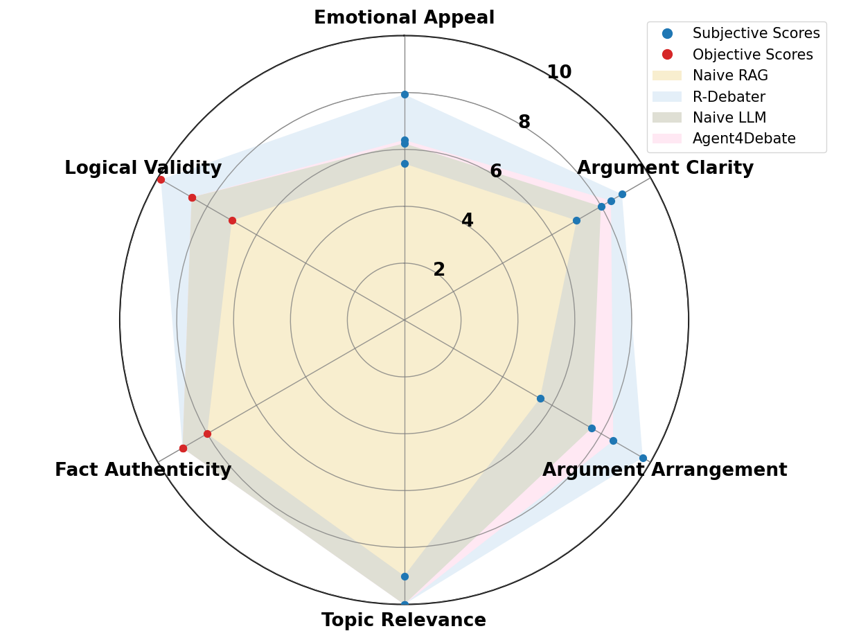 In contrast, R-Debater builds on both paradigms by explicitly operationalizing argumentative memory through retrieval-augmented and role-based mechanisms. It dynamically retrieves debate-specific evidence, assigns strategic roles, and recontextualizes past argumentative moves to generate text that is both stance-specific and globally coherent in rhetorical and strategic senses, thereby achieving a deeper integration of evidence retrieval and rhetorical reasoning within complex multi-turn debates.