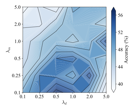 Furthermore, model sensitivity on the two trade-off parameters $`\lambda_m`$ and $`\lambda_d`$ is analyzed on the first task T1. The diagnosis accuracy over different parameter values is depicted as Fig.Ā 8. It can be observed that the diagnosis accuracy varies smoothly with respect to both $`\lambda_m`$ and $`\lambda_d`$ within the middle-bottom region, indicating that the proposed method is not overly sensitive to the exact choice of trade-off parameters in specific ranges. Overall, relatively higher accuracies are achieved when $`\lambda_m`$ is set to small or moderate values, suggesting that excessive emphasis on modality-level disentanglement may suppress modality-specific discriminative information. In contrast, moderate values of $`\lambda_d`$ consistently contribute to performance improvement, highlighting the importance of domain-level disentanglement in reducing cross-domain discrepancies. Specifically, the best performance is obtained when $`\lambda_m`$ is around 0.1-0.25 and $`\lambda_d`$ lies in the range of 0.5-2.0, where a favorable balance between modality disentanglement and domain alignment is achieved. Consequently, $`\lambda_m`$ and $`\lambda_d`$ are set to 0.1 and 0.5, respectively, in this work.