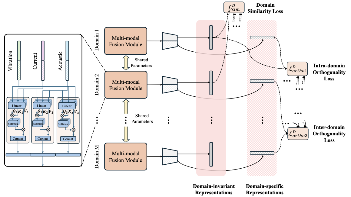 Moreover, existing DG-based fault diagnosis studies rely on a single sensing modality, typically vibration signals. However, using only one type of signal often limits the diagnostic generalization, as different signals capture complementary fault-related characteristics as we mentioned above, particularly for electromechanical machines. Therefore, in the context of DG-based fault diagnosis, multi-modal fusion offers additional potential to enhance robustness against unseen operating conditions, since combining multiple modalities can reduce the reliance on any single domain-specific feature distribution and promote more stable cross-domain generalization. Although numerous studies have explored multi-sensor fusion approaches for fault diagnosisĀ , including data-level fusionĀ , feature-level fusionĀ , and decision-level fusionĀ , significant challenges remain under variable working conditions. First, most existing methods are limited to processing 1D signals from multiple sensors with the same modality sampled at the same frequency. Therefore, they cannot accommodate scenarios in which time-frequency representations are extracted under variable operating conditions, or when different modalities naturally have different sampling frequencies. Second, most methods directly fused data or features from multiple sensors without considering their intrinsic correlations and modality-specific characteristics for specific faults. Moreover, to our best knowledge, there is currently no literature addressing fault diagnosis under unseen working conditions using multi-modal data. Consequently, designing a multi-modal fusion framework that can enhance model generalization across unseen conditions remains a challenging and open problem.