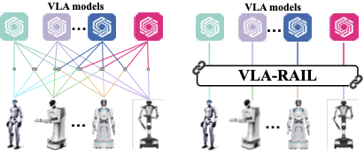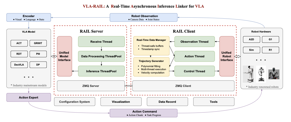 1. **General Asynchronous Inference Framework**: VLA-RAIL acts as a middleware that connects various VLA models and unique robotic platforms. Imagine it like borrowing books from the library; users can easily choose and apply their preferred VLA model.-
