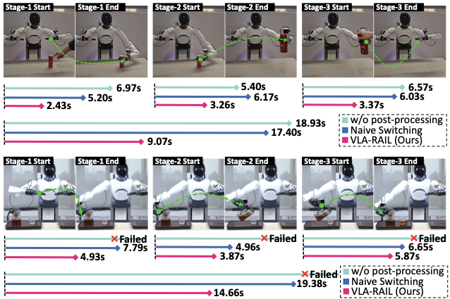 Tea-Pouring Task: The bottom portion presents a more challenging precision manipulation task. Notably, the strategy without post-processing fails to complete Stage-1 and Stage-2, as indicated by the “Failed” markers, highlighting that jerky motion not only slows down execution but can also cause task failures. Naive Switching successfully completes all stages with times of 4.93s, 3.87s, and 6.65s for Stage-1, Stage-2, and Stage-3 respectively, totaling 14.66s. VLA-RAIL achieves the fastest completion with 5.87s for Stage-3 and a total time significantly lower than both baseline methods. The failures observed in the without post-processing strategy underscore that trajectory smoothness is not merely a comfort metric but a critical factor for task success in precision manipulation.