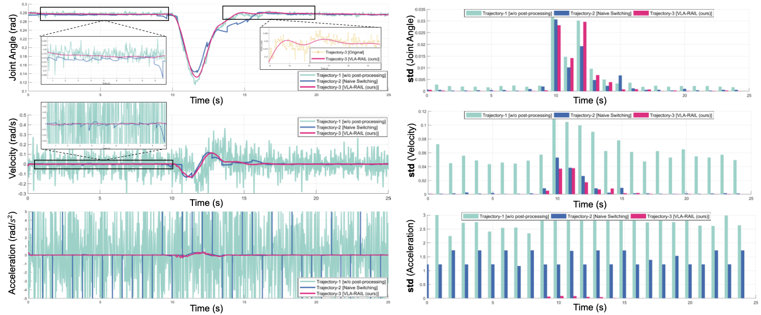 Joint Angle Trajectory: The top-left panel illustrates the joint angle trajectories over time. Without post-processing, trajectory-1 exhibits noticeable high-frequency fluctuations throughout the motion, particularly evident in the zoomed-in view of the trajectory segment from 0 to 10 seconds. The naive switching strategy (Trajectory-2) reduces some fluctuations through intra-chunk polynomial fitting but still shows abrupt transitions at action chunk boundaries. In contrast, VLA-RAIL (Trajectory-3) produces a smooth, continuous curve that closely follows the intended motion profile while filtering out prediction noise. Specifically, the zoomed-in view of the trajectory segment from 14 to 20 seconds directly compares the original VLA model output (Trajectory-3 [Original]) with the VLA-RAIL post-processed result (Trajectory-3 [VLA-RAIL]), demonstrating the effectiveness of our smoothing algorithm in preserving the overall trajectory shape while eliminating prediction noise.
