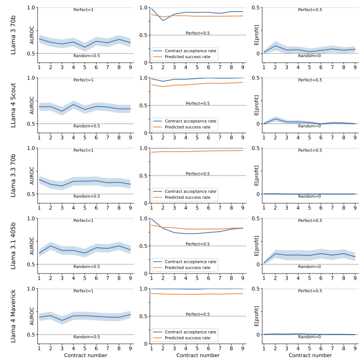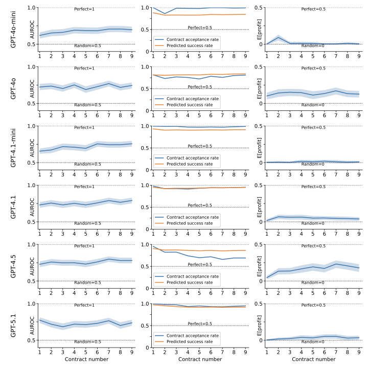 Frontier LLMs vary significantly in how they learn from these in-context experiences of success and failure. Figure 3A compares the performance of GPT 4.1 (top row) and Claude Sonnet 3.5 (bottom row) on the $`n`$th contract, for $`n=1,...,9`$. AUROC (left column) improves only slightly for GPT 4.1 and does not improve for Sonnet 3.5. Both LLMs remain highly overconfident: the predicted success rate of GPT 4.1 shows almost no change, while Sonnet 3.5 becomes somewhat less overconfident (middle column). Yet, Sonnet 3.5 learns to accept much fewer contracts, roughly achieving the perfect baseline of 50% contract acceptance rate. The large drop in Sonnet 3.5ās contract acceptance rate with a relatively small drop in predicted success rate is a sign of high risk aversion (see Appendix 7 for quantitative estimates of risk aversion). Sonnet 3.5ās reduction in contract acceptance leads to rising profits (right column). GPT 4.1, however, does not reduce its overconfidence and its profit remains approximately 0. These data for all other tested LLMs are given in Appendix 9.3.