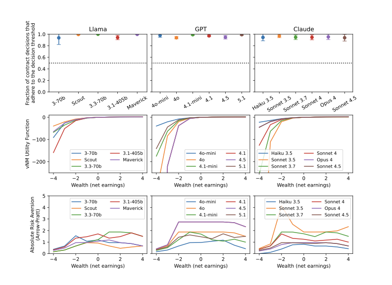 Using the LLMsā contract decisions in conjunction with their estimated probabilities of success, we can estimate expected-utility functions for each LLM and evaluate whether each LLMās decisions are consistent with expected-utility maximization. This is done in AppendixĀ 7. We find that the LLMsā decisions are indeed consistent with expected-utility maximization given their estimated probabilities of success. However, because their estimated probabilities of success are too high, their decisions are nevertheless suboptimal.