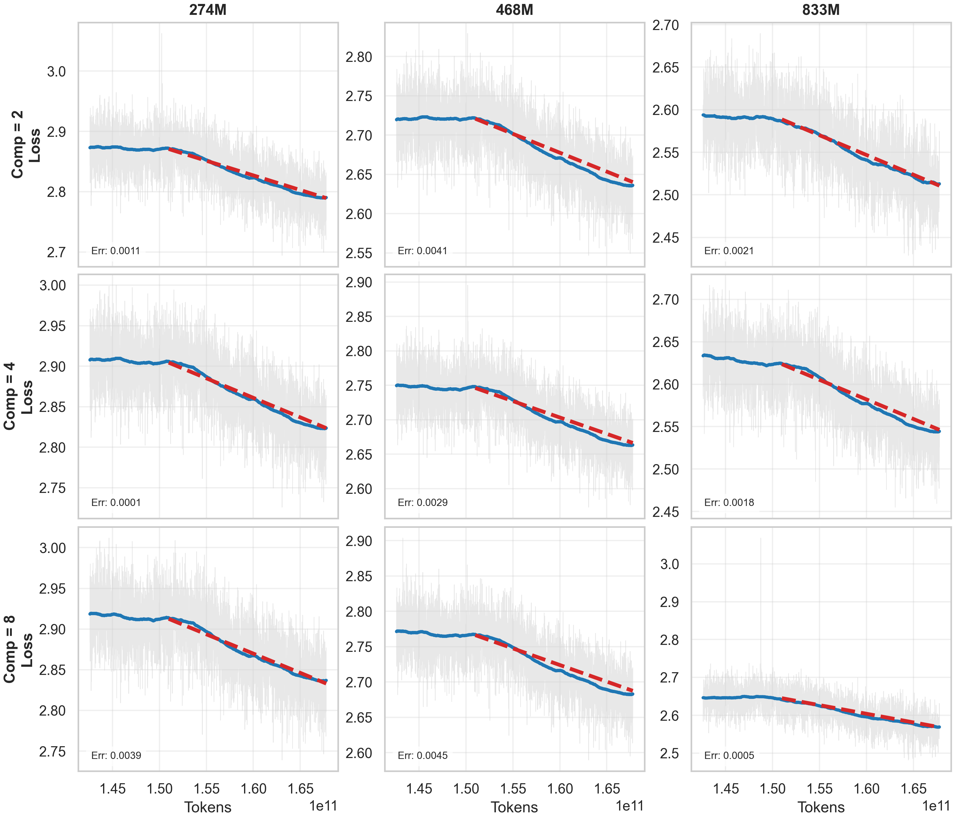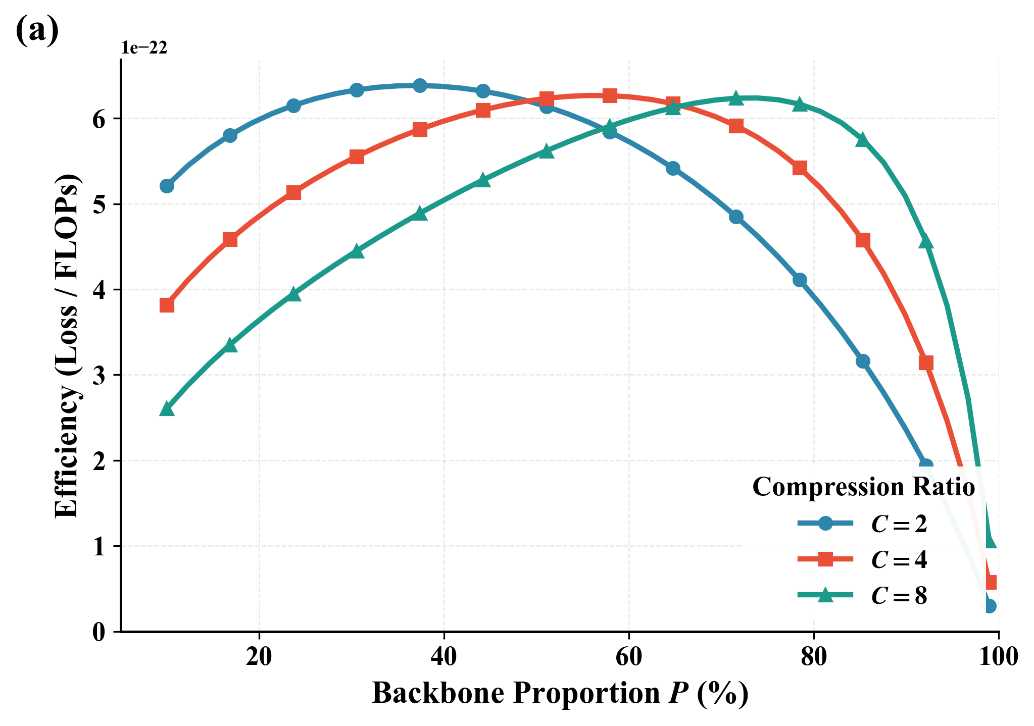 Compression-aware scaling law for hierarchical LMs. We derive a scaling law $`L(N,D,R,P)`$ that explicitly models the interaction between total parameters $`N`$, data $`D`$, compression ratio $`R`$, and concept-backbone allocation $`P`$, enabling principled selection of architecture under equal-FLOPs constraints.