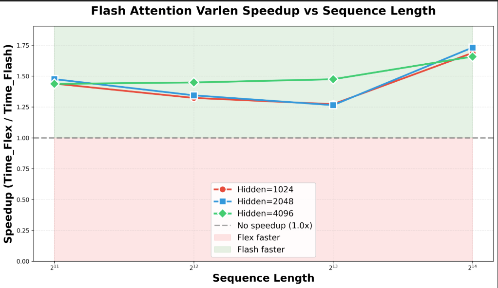 | Seq Length | Hidden Size | Flex (ms) | Flash Varlen (ms) | Speedup |