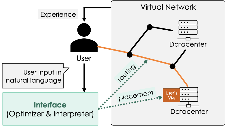 This section formulates the overall system design, including the Optimizer and the Interpreter. The Optimizer formulates the virtual network allocation problem as an ILP, which determines VM placement and routing. The objective function and the constraints of the optimization problem are parametrized by $`\theta`$, which represents the updateable specification of the virtual network allocation problem. The Interpreter estimates the userâs requirements based on their chat text in natural language format, referred to as the âpromptâ. The examples of Interpreter implementations are described in Subsection 3.3. The iterative process of parameter update is performed to align network services with user preferences and requirements. The chat steps are denoted by $`k=0,1,\ldots`$. The updatable parameter $`\theta(k)`$ and decision variables $`(x(k),y(k))`$ are dependent on the chat step $`k`$, which are often denoted as $`(x,y)`$. Symbols used in this paper are shown in Table [T:M.Symbols].