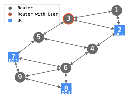 We establish a simplified setting of the virtual network service and the virtual network allocation problem. In the problem, each user rents a single VM. The network topology is a directed graph where routers and links are represented as nodes and edges, respectively. Datacenters (DCs) are a special type of router that places VMs and have substantial compute resources like CPUs and memory. Each user needs to rent a VM within a DC and to communicate with the VM through the links.